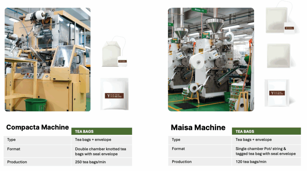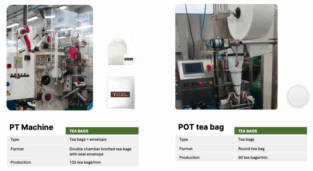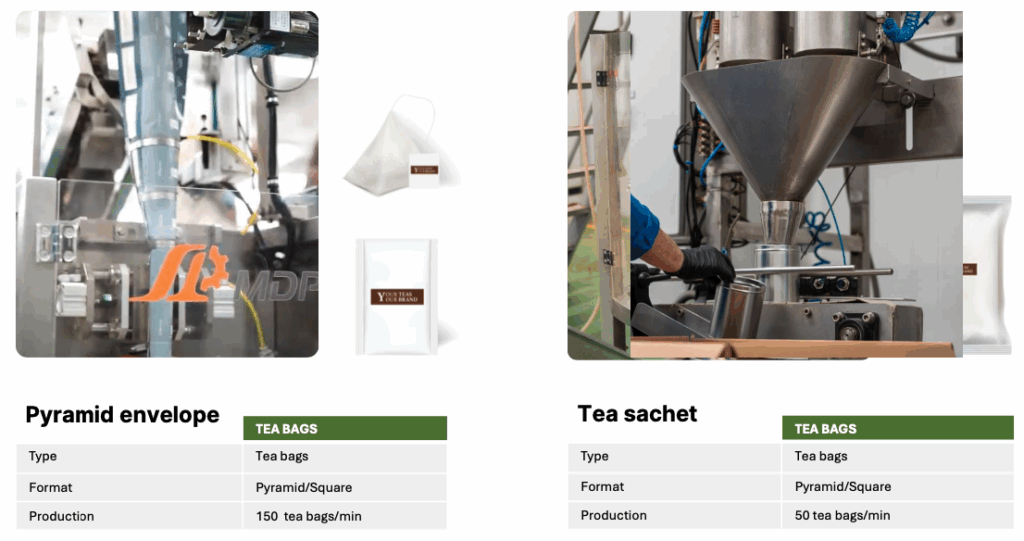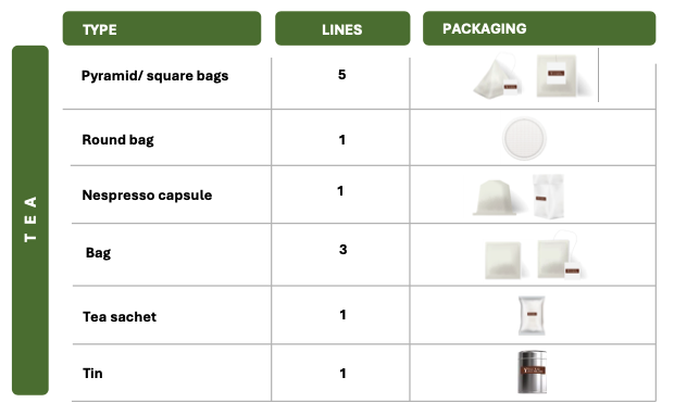 • Pyramid / square bag – 250 tea bags / min